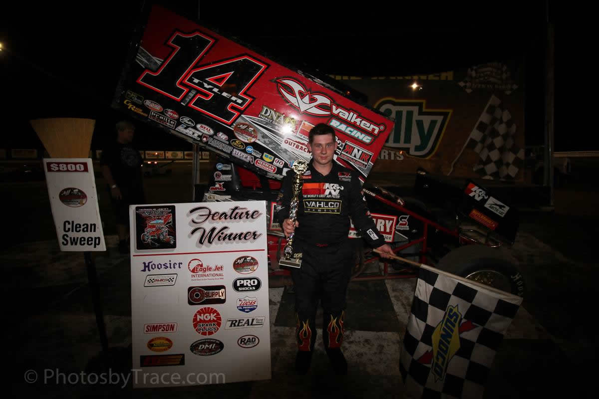 On Saturday night Tyler Clem returned behind the wheel of his Sprint Car at Bubba Raceway Park (Ocala, Florida) for the Eagle Jet Top Gun Winged Sprint Car Series. Starting in 4th in a field of sixteen cars, Clem worked his way to the front picking up his first victory of the 2016 season with Matt Kurtz, Garrett Green, Dennis Misuraca, and Brandon Denton rounding out the top five. (Photo by Trace)